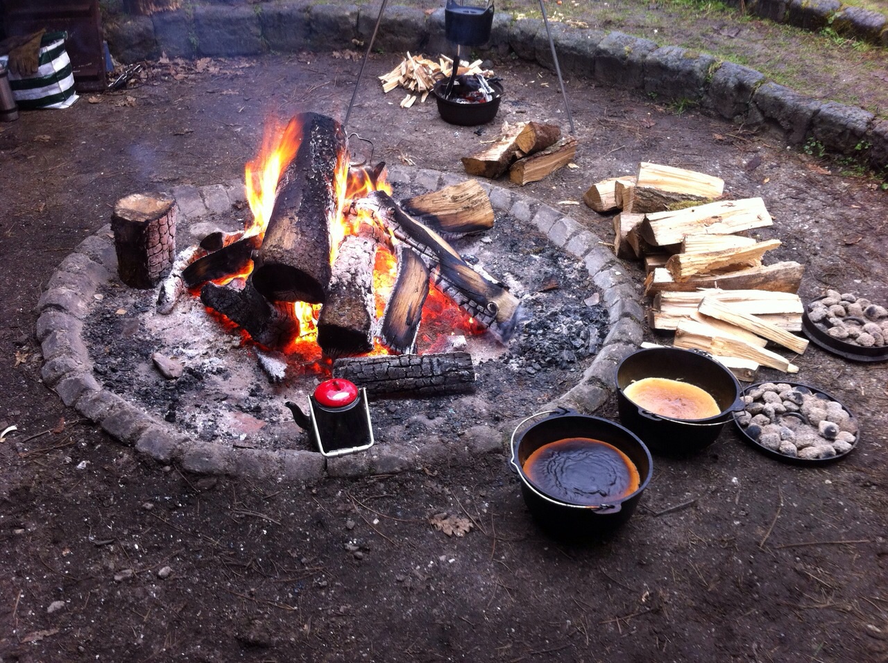 Het is leuk te improviseren met verschillende mogelijkheden om eten te bereiden boven een houtvuur. Je kunt grillen, bakken, stoven en pruttelen, oventjes bouwen, draaispit maken etc. Wat belangrijk is dat je een pan hebt die in of boven het vuur kan. Een Dutch Oven is daar uitermate geschikt voor, maar elke andere gietijzeren of ijzeren pan kan ook. Je moet het alleen niet erg vinden dat die pan er na afloop zwartgeblakerd uit zal zien.