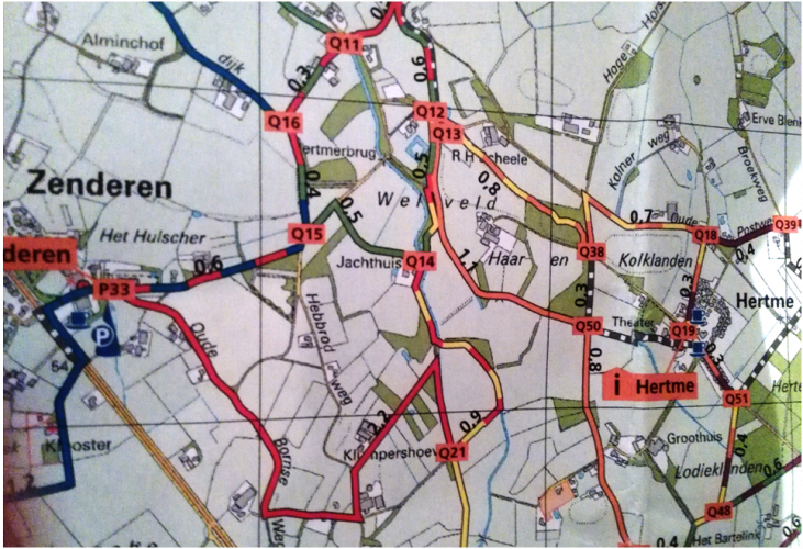 We lopen vanaf Lutke Hulscher nnaar knooppunt P33 en verder over de Oude Bornse weg naar Q21, Q14 en Q13. Let op bij Q13 rechtsaf naar Q38 Q50 en weer terug naar Q13/Q12. Langs het water verder naar Q11 en dan met een bocht naar Q16 Q15 weer terug naar P33 en de parkeerplaats. Eventueel kun je het kaartje gebruiken om de route in te korten.